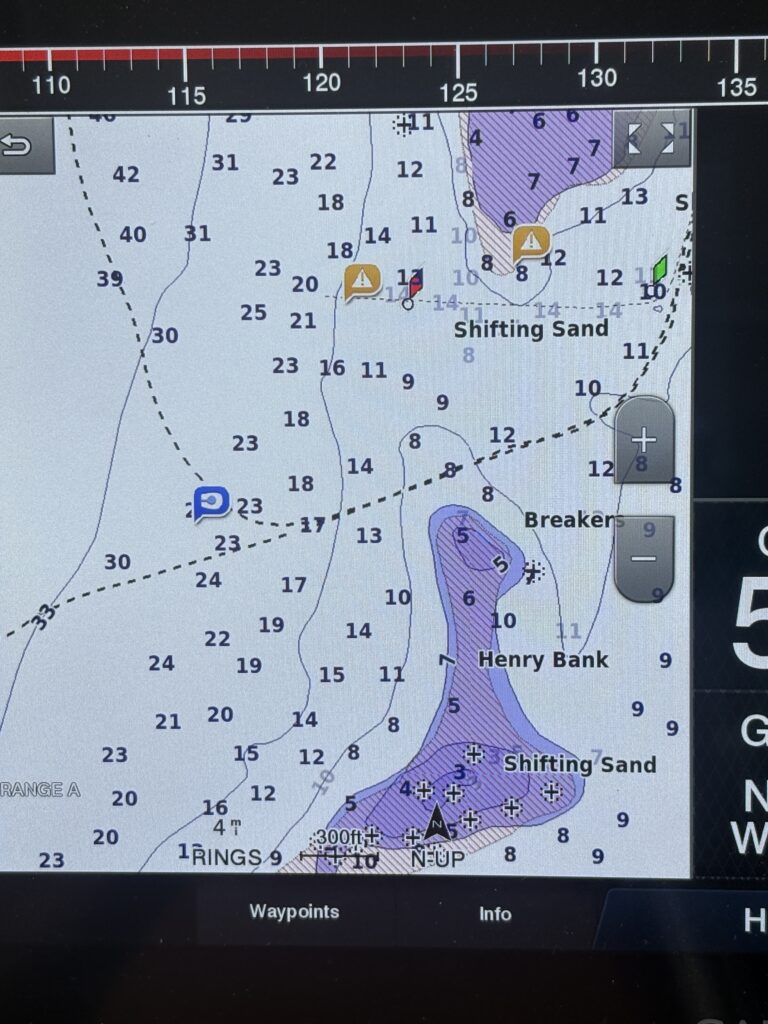 When Georgetown finally appeared on the screen, we had one last challenge, another tricky entrance. It looked straightforward on Navionics, but looks can be deceiving. The boat in front of us followed the Nav track and promptly ran aground.