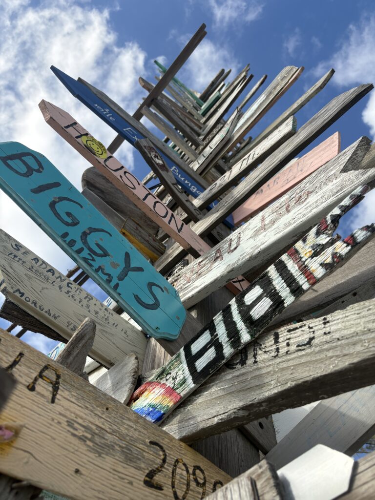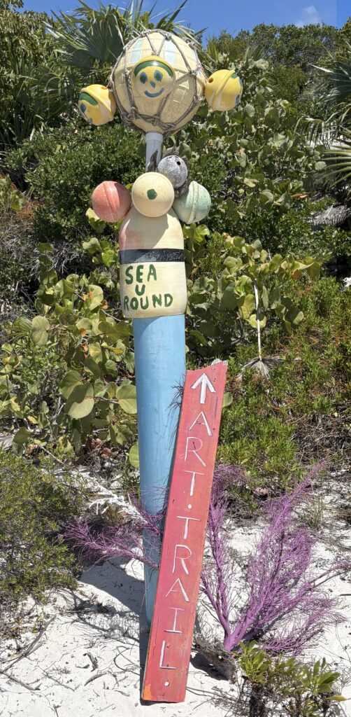 Some of our favorite George Town memories didn’t happen at a bar or even on the boat, they happened on foot. There’s this little dusty path just off the beach, known to cruisers as the Art Trail. You have to find it, and when you do, it’s like stepping into a salty scrapbook. Along the trail are weathered bits of driftwood, hand-painted by sailors passing through over the years. Some are bright and fresh, others faded and chipped, each one a little story left behind.