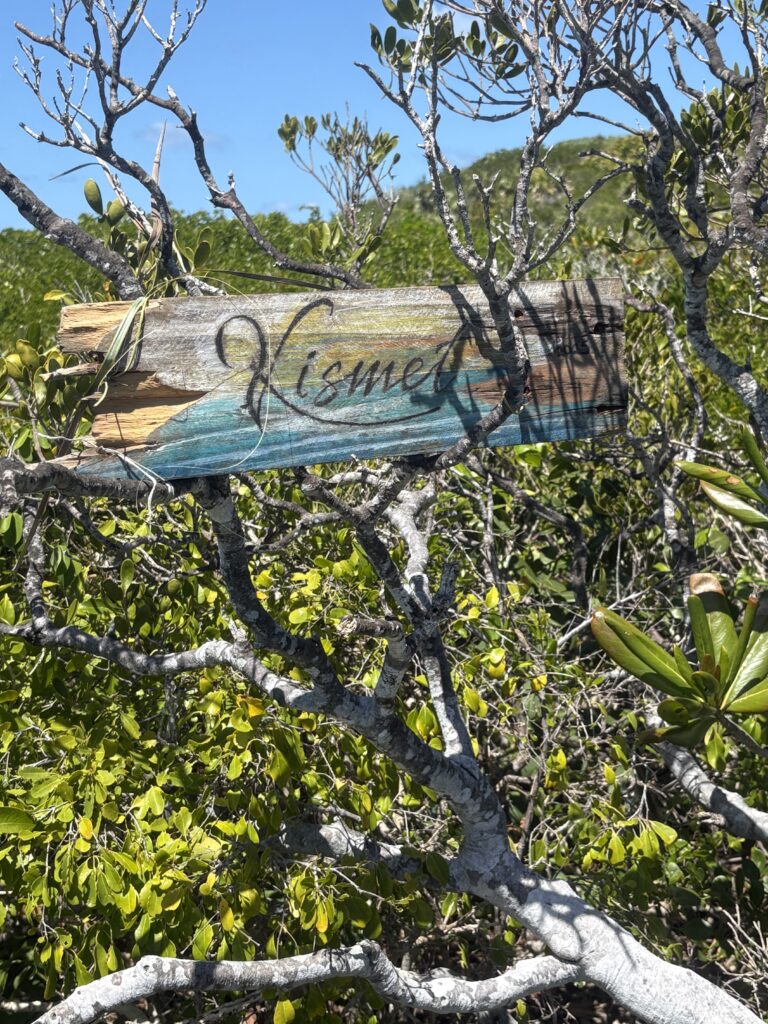 Rodney had actually painted our “Kismet” sign back in Black Point, during one of those windy days when we were stuck on the boat. Bright colors, bold letters, pure Rodney style. Once in George Town, we carried it ashore and found it the perfect home along the trail. Now there’s a tiny piece of us out there, a salty little “We were here too.”